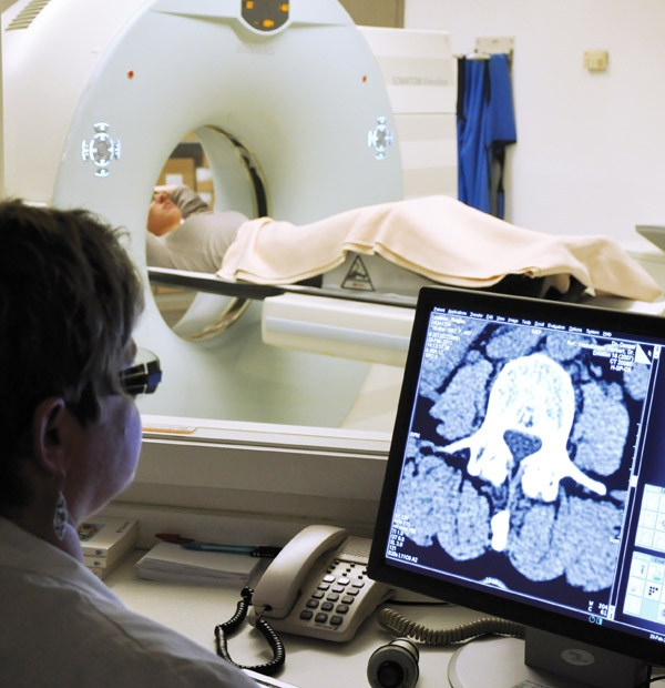 Bei chronischen Rückenschmerzen, die von der Wirbelsäule bzw. den Bandscheiben ausgehen, kann eine CT-gezielte Nervenwurzelinfiltration erfolgen.