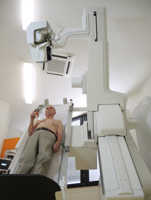 Röntgenstrahlen durchdringen den Körper, die dabei unterschiedlich abgeschwächten Strahlen werden detektiert und erzeugen so die klassischen Röntgenbilder.
